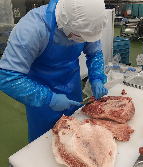 整形工程 部分肉を各部位ごとに商品用途に沿った整形、スライス、焼肉用に分割していきます。 -