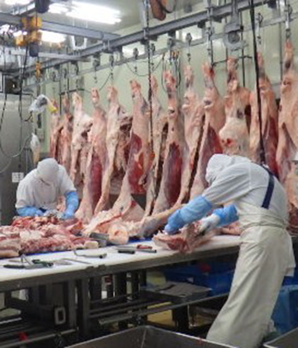 鳴尾浜工場製造工程 食肉加工処理室内では、枝肉の解体、脱骨、分割、お客様のオーダーに合わせた整形をおこなっております。熟練された担当技術者によって1つ1つの作業を丁寧におこない、徹底された品質管理をおこない、製品の品質を保っております。