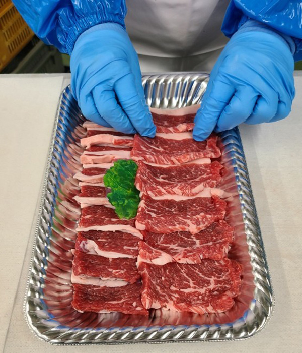 盛付工程 焼肉用にスライスされた肉を1枚ずつトレーに盛付していきます。ファミリーに人気の商品です。 -